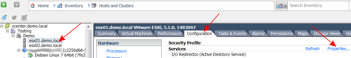 W przeciwnym razie, musisz włączyć sobie usługę SSH na serwerze. Zaloguj się do vCenter lub konsoli Web. Z widoku „Home/Inventory/Hosts and Clusters” wybieramy z drzewa naszego hosta. W zakładce „Configuration” w sekcji „Security Profile” wybieramy „Properties…”