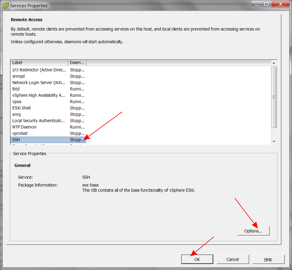 Na liście serwisów odnajdujemy „SSH”. Klikamy „Options…”