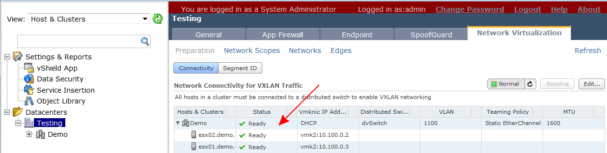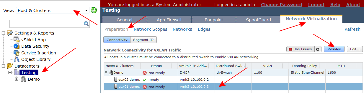Na tym etapie nasze ESXi jest już zaktualizowane do nowej wersji. Warto jednak zajrzeć do konsoli vShield Manager’a i upewnić się że VIBy do vShielda wgrały się poprawnie i konfiguracja jest poprawna. Logujemy się jako administrator. Wchodzimy do widoku „Host & Clusters”. W zakładce „Network Virtualization” wchodzimy do „Preparation” i tam do zakładki „Connectivity”. Z listy hostów skonfigurowanych dla VXLAN wybieramy serwer który ostatnio aktualizowaliśmy. Akurat VIB nie wgrał się poprawnie – nic straconego. Klikamy „Resolve” – vShield Manager wysyła niezbędne paczki do ESXi.